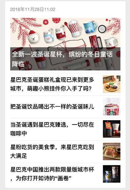 星巴克有一批忠实的粉丝,所以服务号文章很少做减价促销,内容以新品推介为主。新品除了涉及新品咖啡和星冰乐,还有蛋糕礼盒和茶品,2016年里还应季推出了星冰粽和“可以吃的星冰乐吸管”。作为星粉儿,看到这样的消息,不买至少也要了解一下,才能跟上星爸爸的脚步。