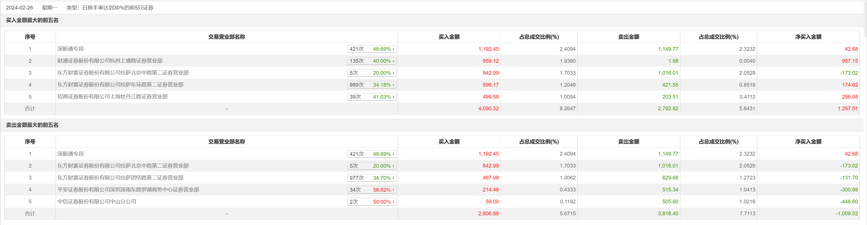 具体来看,深股通专用、财通证券杭州上塘路证券营业部分别买入1192.45万元、959.12万元;深股通专用、东方财富证券拉萨北京中路第二证券营业部分别卖出1149.77万元、1016.01万元。
