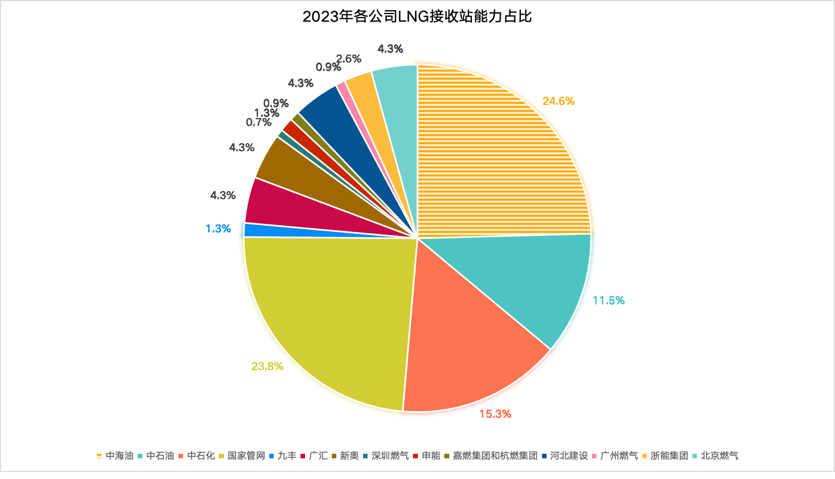 《报告》显示,2023年,国家管网和“三桶油”的LNG接收能力占比为75%,同比下降10%;以广汇能源、新奥能源、河北建设、北京燃气为主的民企占比25%,同比大幅提升10个百分点。
