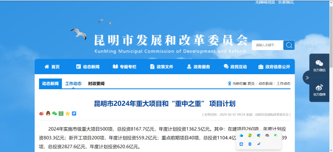 昆明市发改委近日发布的“昆明市2024年重大项目和‘重中之重’项目计划”(以下简称“计划”)显示:今年,昆明将实施市级重大项目500项,总投资8167.7亿元,年度计划投资1362.5亿元。