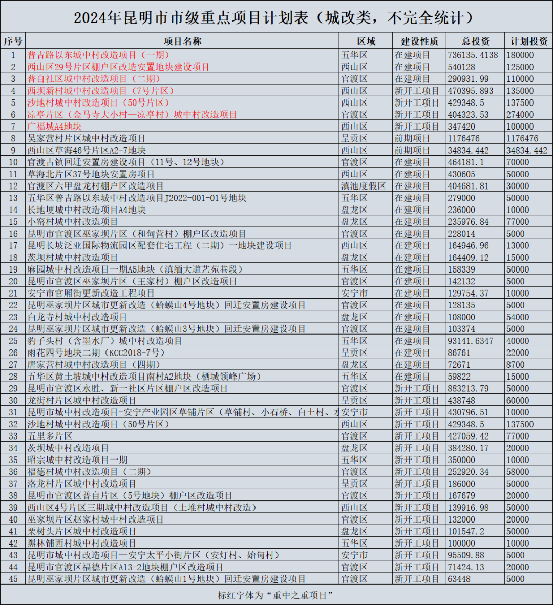 据不完全统计,有45个城改项目被纳入重点名单,包括城中村改造、棚户区改造。城改在建项目年度投资约137亿元,新开工项目今年拟投资约155亿元。从这些数据,可以看出昆明大力推进城市改造的决心。
