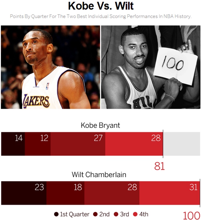 2006年1月22日,科比在湖人122-104战胜猛龙的比赛中独得81分,只有1962年维尔特-张伯伦在费城勇士队拿到的100分比他更多。