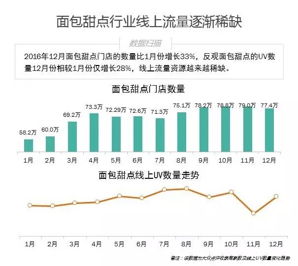 1. 过去的一年,面包甜点类商铺仍然保持了高速增长,但线上浏览UV增长却不及商铺的增速,这也说明面包甜点界线上流量的争夺将日趋激烈;