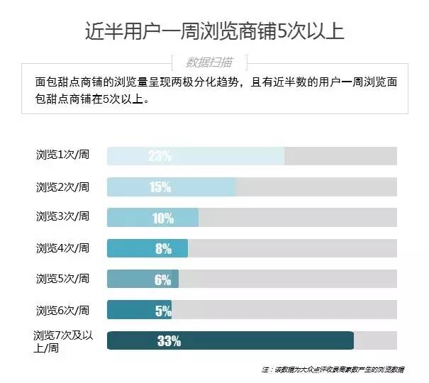 4. 面包甜点不缺少忠实用户, 将近一半的用户每周会在线浏览甜点类店铺5次以上;