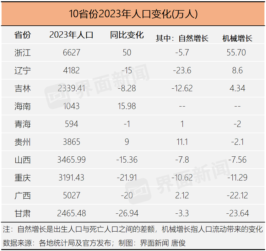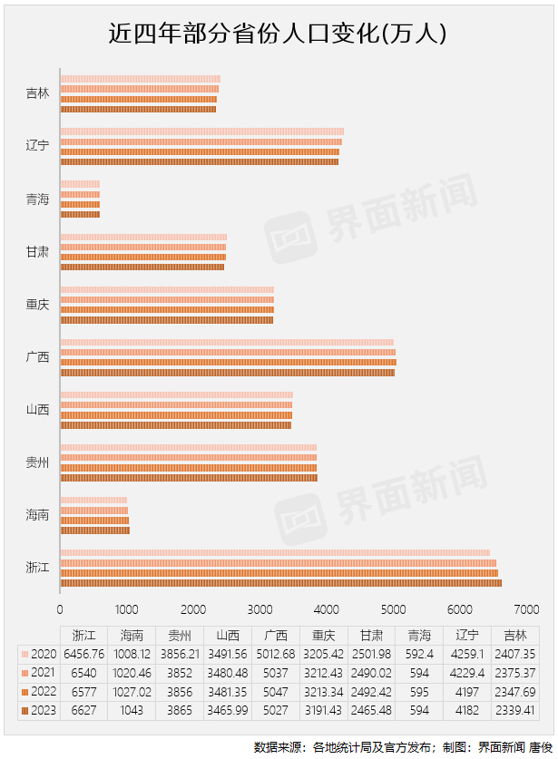 根据界面新闻统计,过去四年,浙江和海南的人口一直在增加,但西部省份人口并非一直在下降。贵州在2021年人口出现下降,此后两年人口增长。山西、广西、重庆、甘肃在疫情期间人口一度有所上升,但在2023年人口出现下降。