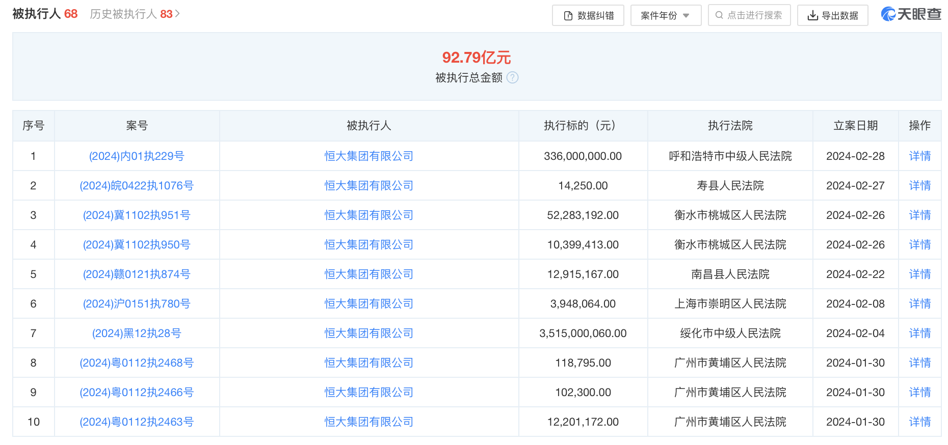 天眼查法律诉讼信息显示,2月28日,恒大集团有限公司以及恒大旗下内蒙古恒鑫旅游开发有限公司、儋州中润旅游开发有限公司、内蒙古恒大旅游开发有限公司新增一则被执行人信息,执行标的3.3亿余元,涉及金融借款合同纠纷案件,执行法院为呼和浩特市中级人民法院。风险信息显示,恒大集团有限公司现存60余条被执行人信息,被执行总金额超92亿元,此外该公司还存在多条限制消费令、失信被执行人(老赖)和终本案件信息。
