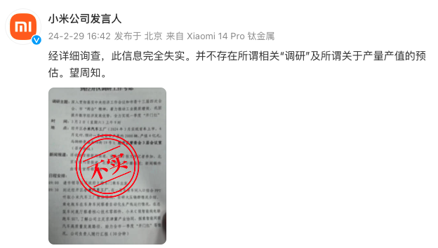 2月29日,@小米公司发言人 发文称,经详细询查,此信息完全失实。并不存在所谓相关“调研”及所谓关于产量产值的预估。