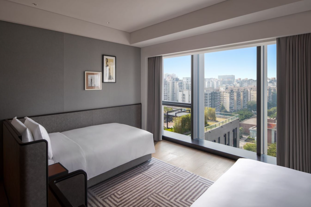 酒店双床房的并排朝窗设计更显新意,高脚凳和一体式双人大理石办公桌让办公更舒适且便捷交流沟通。