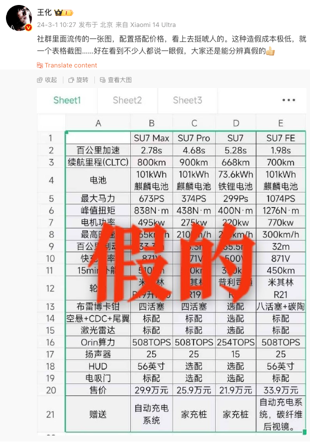 1月5日,小米集团公关部总经理王化在微博发文,辟谣网传小米汽车配置及价格。王化表示,“社群里面流传的一张图,配置搭配价格,看上去挺唬人的。这种造假成本极低,就一个表格截图……好在看到不少人都说一眼假,大家还是能分辨真假的。”根据网传的表格,小米汽车基础款价格为21.9万元。