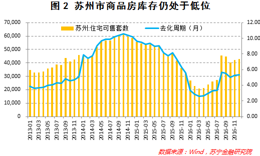在2015年商品房销售快速上升的情况下,2016年一季度苏州市房地产库存持续下行,最低仅为2万套,去化周期只有2.6个月。自2016年4月以来,苏州住宅短期库存水平稳步上行,到12月底的可售量为4.3万套,比最低点回升超过100%,出清周期升至5.3个月(参见图2)。