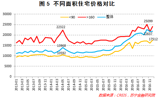 值得注意的是,2016年下半年,随着整体成交量的下行,90㎡以下的中小户型价格基本稳定,但大户型价格波动幅度较大。2016年11月,160㎡以上户型成交均价为2.17万元/㎡,比10月环比下跌13.7%,12月成交均价又较11月环比上涨11.3%;而11月90㎡以下和市场整体均价环比跌幅分别为6%和4.3%,12月的环比涨幅分别为8.4%和4.6%(参见图5)。