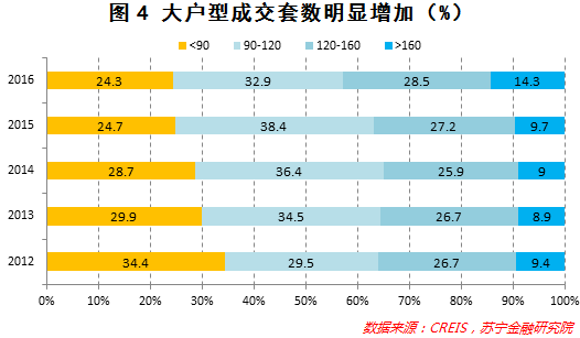 在市场热度提升的同时,苏州大户型成交占比明显上升,表明这一轮成交量增长主要源于改善类需求的释放:从成交套数来看,2015年,120-160㎡和160㎡以上户型的成交套数占比分别为27.2%和9.7%,是2012年以来的最高水平,2016年1-11月,占比进一步上升至28.5%和14.3%,160㎡以上户型的占比扩大最为明显(参见图4)。