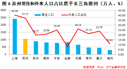 强大的园区经济,推动苏州第二产业和县域经济快速发展,促使苏州市人口持续流入,其中外来人口规模和占比均位居长三角第二位。截至2015年末,苏州常住人口达1062万人,在长三角城市中居于第二位。在常住人口中,非本地户籍人口达395万人,其规模和占比在长三角城市中仅次于上海,是第三名杭州的两倍以上(参见图6)。而且,苏州目前仍呈现人口净流入态势。