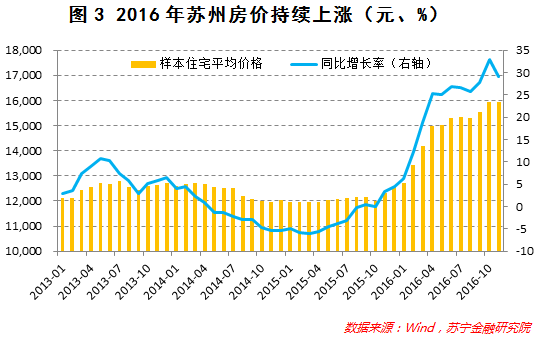 虽然2016年下半年苏州商品房库存出现一定的回升,但去化周期仍处于低位,继续呈现供不应求的局面,这导致2016年苏州市房价快速上升。成交均价自2015年下半年以来持续上涨,2016年调控政策出台以来,近2个月高位盘整。2011-2014年,苏州新房成交均价一直稳定在1.1万元/㎡左右,但从2015年开始,苏州房价快速上涨,从2015年1月的1.19万元/㎡上涨至2016年的11月的1.59万元/㎡,涨幅达33%;样本住宅均价同比涨幅也不断提升,2016年4月突破20%,此后最高上涨至32%。2016年10月份出台调控政策后,苏州房价出现阶段性盘整,11月份同比涨幅有所回落,但房价仍处于历史高位。