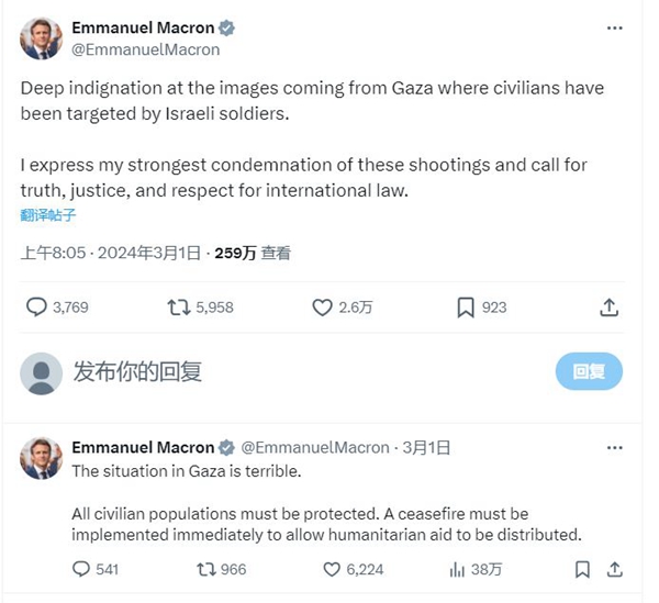 法国总统埃马纽埃尔·马克龙发文称其对加沙平民成为以色列士兵袭击目标的画面“深感愤怒”,法国外交部要求以色列“必须”遵守国际法。