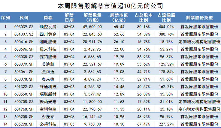 其中,解禁市值超过10亿元的公司有14家,前三分别为顺控发展(003039.SZ)、四川黄金(001337.SZ)和湘电股份(600416.SH)。