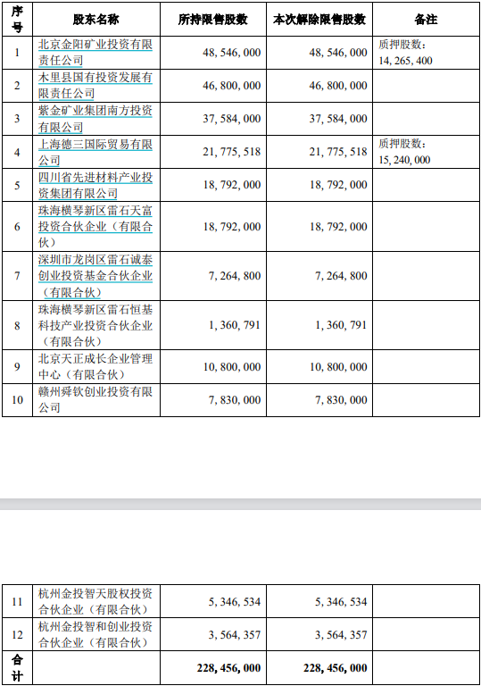 四川黄金本次限售股解禁明细