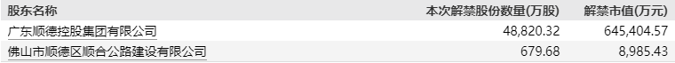 此次解禁为公司第一大股东广东顺德控股集团有限公司和第三大股东佛山市顺德区顺合公路建设有限公司。公司发行价为5.86元/股,最新收盘价为13.22元/股,解禁股东账面浮盈约125%。原始股东持股成本更低,收益因而更高。不过解禁筹码集中,解禁压力有限。