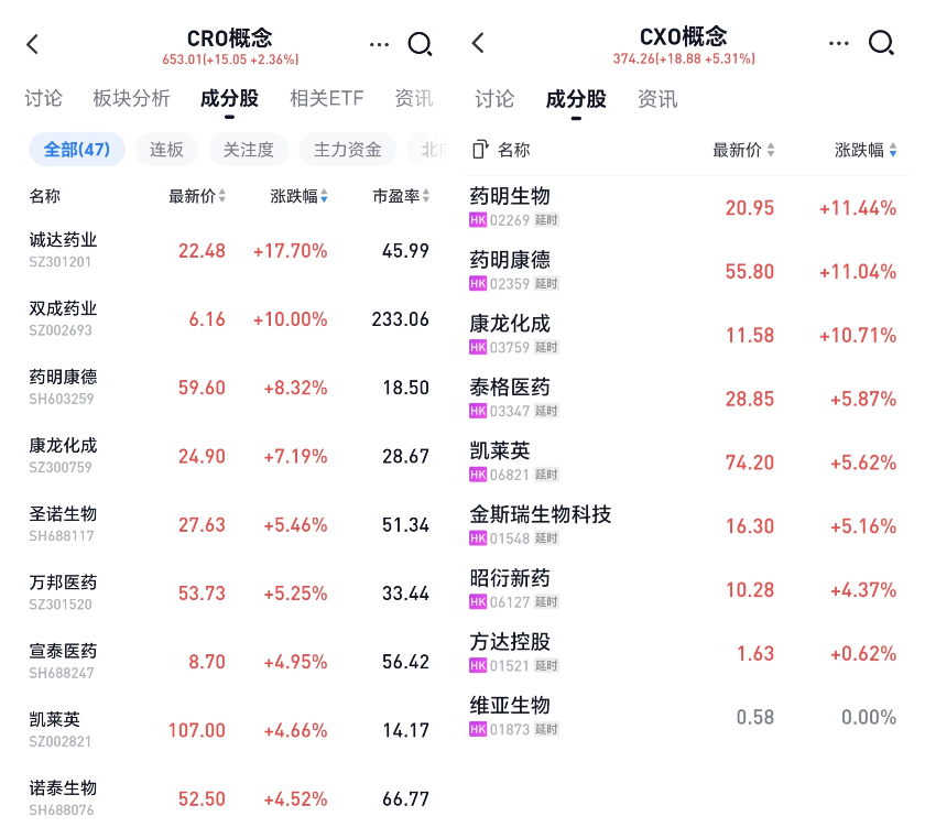 3月4日,国内CXO(医药外包)概念股开盘高涨。A股方面,药明康德A股盘中涨停,涨停价报60.52元/股,康龙化成、凯莱英、博腾股份、药石科技等均大幅跟涨。H股方面,康龙化成、药明康德、药明生物涨超10%,凯莱英、泰格医药涨超5%。此后,两市CXO概念股盘中回落。