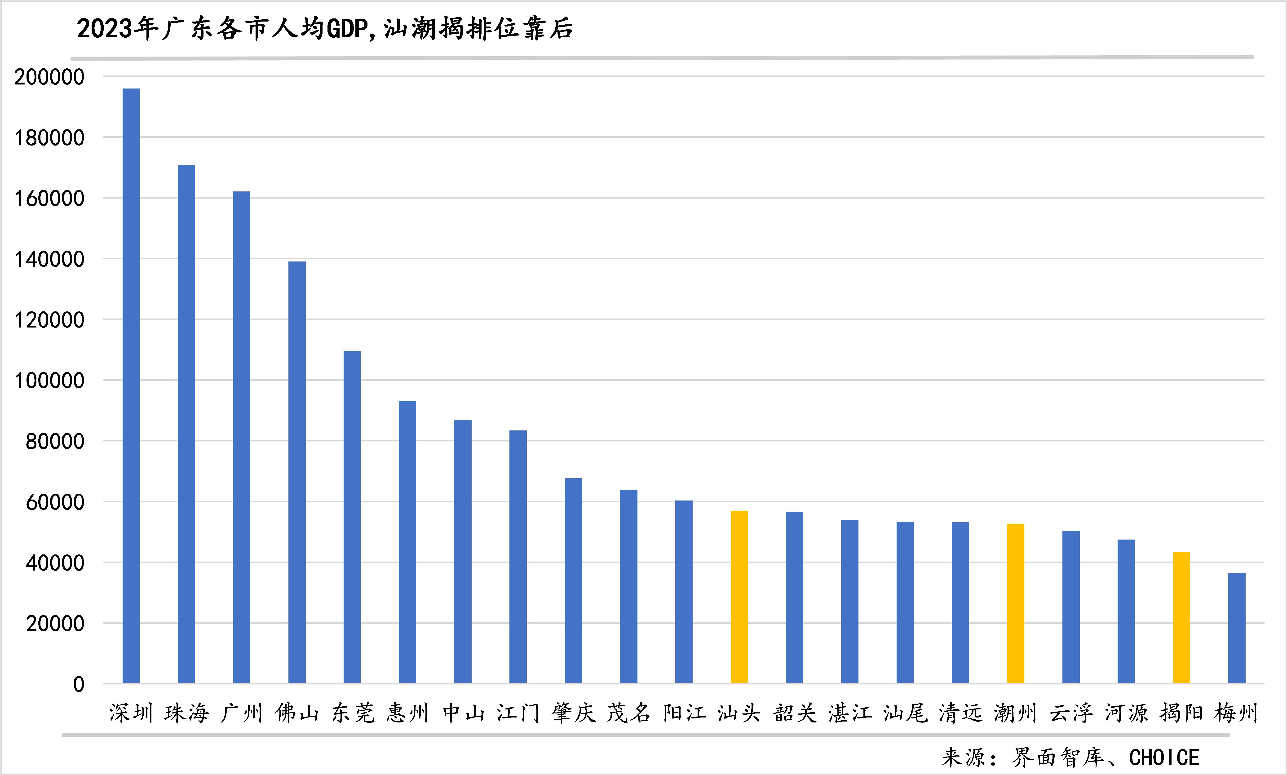 就人均GDP而言,2023年潮汕地区三市的人均GDP在广东省排位靠中后,汕头、潮州和揭阳在广东21个地级市中依次排第12、17、20位,且与排名靠前的地区相差较大。以三地中人均GDP最高的汕头为例,其不足深圳的三成、仅为珠海的三分之一、广州的三成半、佛山的四成、略超东莞的一半。