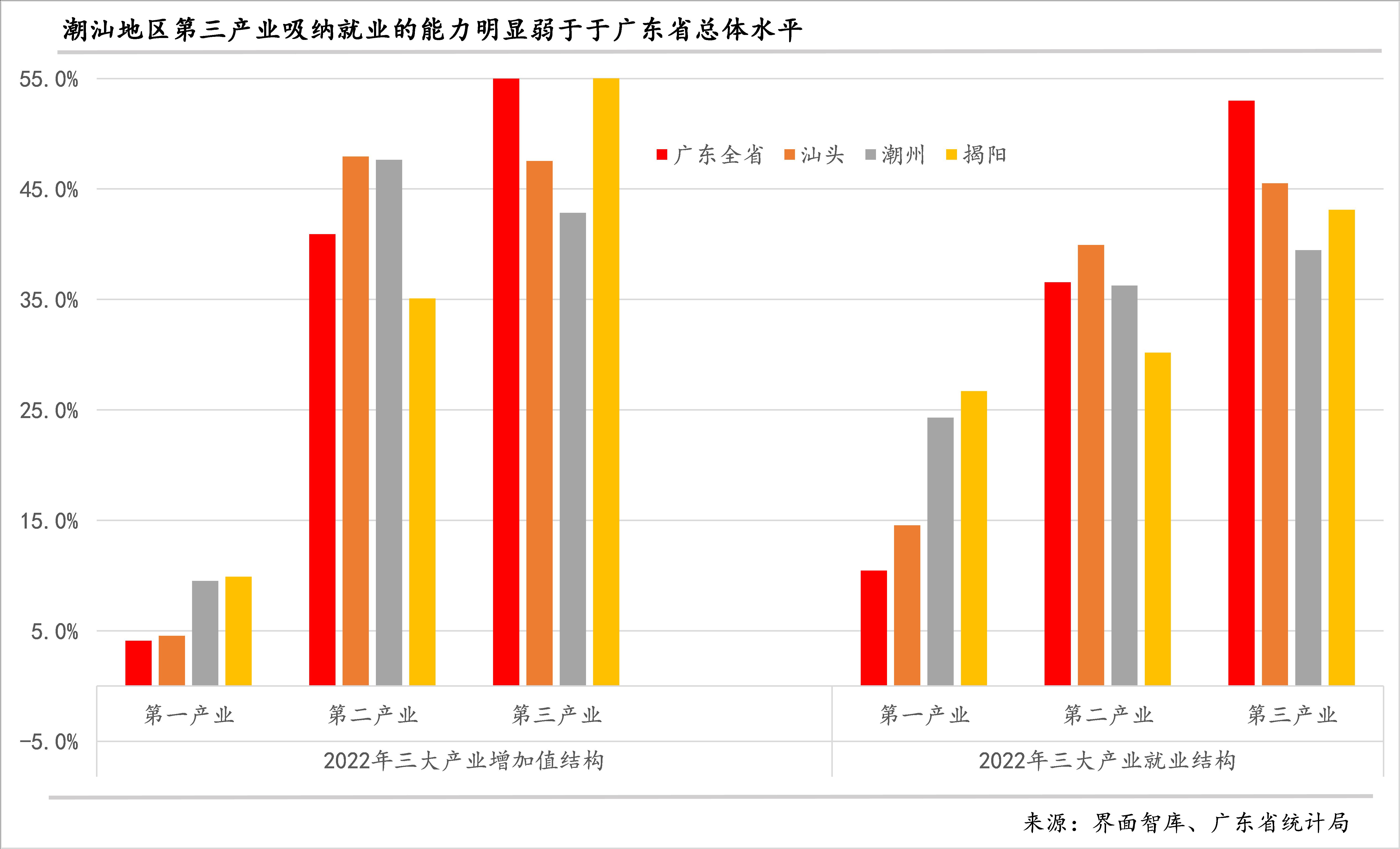 对于就业结构而言,潮汕地区则明显向乡村和第一产业倾斜。以2022年为例,汕潮揭三地乡村就业的比重虽然较2010年、2021年有所下降,但仍显著高于广东省总体水平,都高出22个百分点左右;三地在第一产业就业的占比明显高于广东总体水平,也显著高于各自第一产业增加值占比,这意味着大量富裕劳动力有待转移。与之相应的是,三地在第三产业则的就业占比均明显低于广东省总体水平,也低于第三产业增加值,尤其是揭阳第三产业吸纳就业的能力最弱,其第三产业增加值占比超过50%,但仅吸纳了43%的就业。