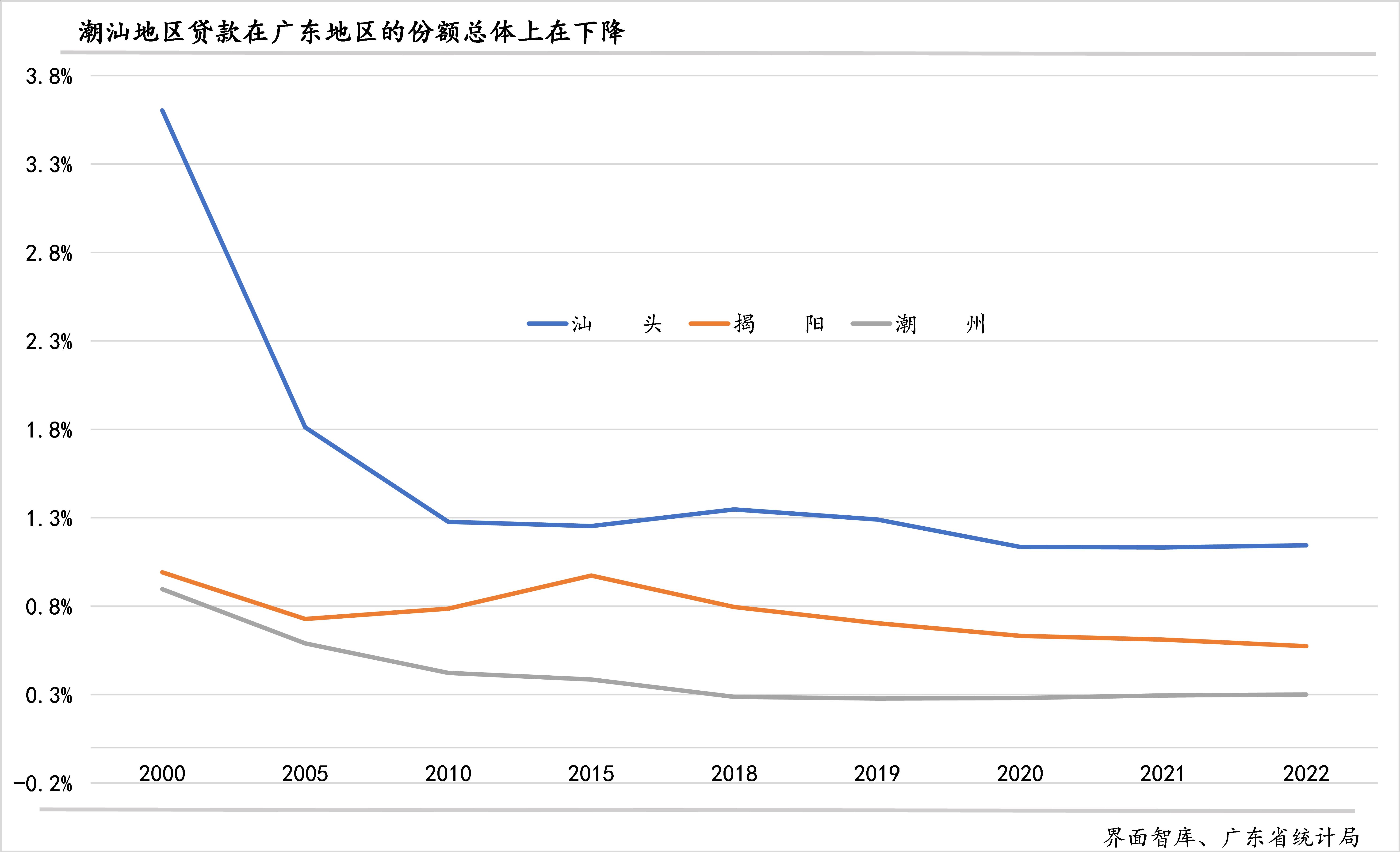 三是对资金的吸引力低。一方面,侨乡优势未发挥。在外商直接投资中,三地签订的项目数、合同利用金额及实际使用金额在全省的占比均排在中后。以2022年为例,汕潮揭三地实际使用外资金额在广东的份额均不足0.4%(依次分别为0.11%、0.39%、0.24%),不仅大幅低于珠三角地区城市,甚至低于粤北的清远、河源。另一方面,三地贷款在全省中的份额也比较少,潮州在各市中占比最低,揭阳仅高于三个市,汕头略超1%、排位居中。