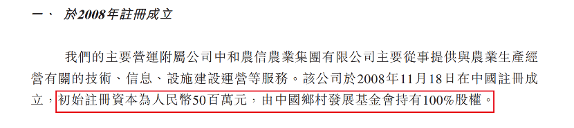 直到2008年11月,才组建了中和农信的主要营运附属公司——中和农信农业集团有限公司(以下简称:中和农信农业),由中国乡村发展基金会持有100%股权,主要从事提供与农业生产经营有关的技术、信息、设施建设运营等服务。
