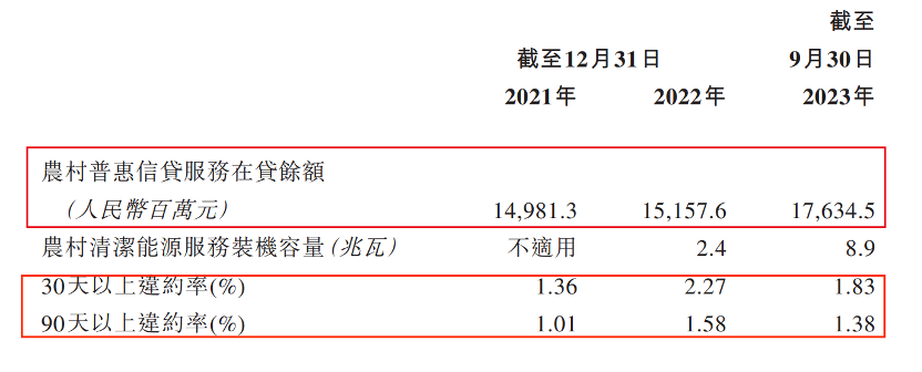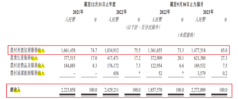 其中,农村普惠信贷服务是企业的支柱业务。2021年至2023年前9月(以下简称:报告期),公司实现总收入22.24亿元、24.29亿元、22.72亿元。其中,农村普惠信贷服务收入分别占比74.7%、75.5%、65.0%。
