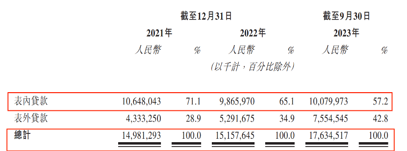 「创业最前线」注意到,作为一个小额贷款公司,中和农信的表内贷款占比却在急剧下滑。2021年至2023年前9月,公司在贷余额分别为150亿元、152亿元及176亿元。其中,71.1%、65.1%及57.2%为表内贷款,由公司拨款。