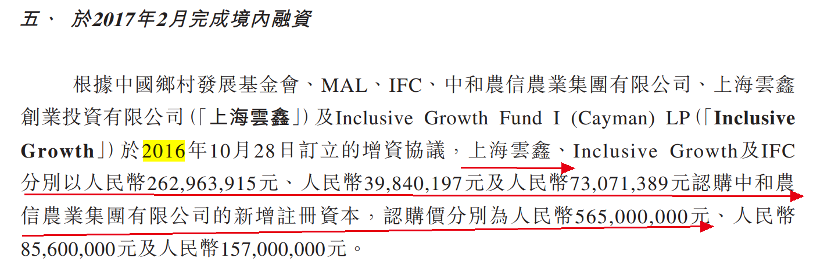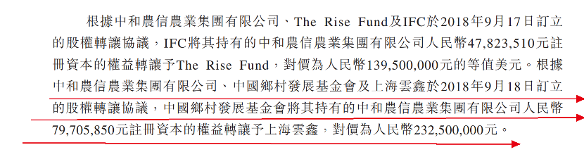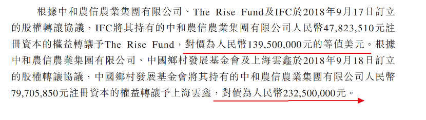 2018年9月,IFC(国际金融公司)将其持有的中和农信农业4782.35万元注册资本的权益转让予The Rise Fund,对价为1.395亿人民币的等值美元;中国乡村发展基金会将其持有的中和农信农业7970.59万元注册资本的权益转让予上海云鑫,套现2.33亿元。