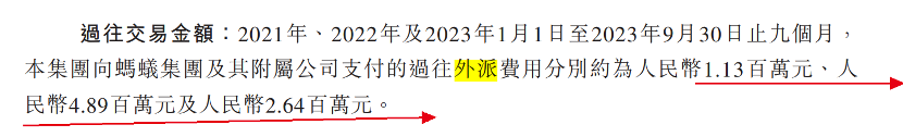 招股书显示,2021年-2023年前9月,集团向蚂蚁集团及其附属公司支付的过往外派费用分别约为113万元、489万元及264万元。