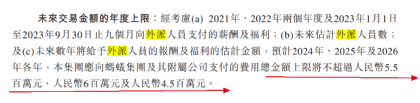 未来这一外派举措还会继续。中和农信预计,2024年-2026年,集团应向蚂蚁集团及其附属公司支付的费用总金额上限将不超过550万元、600万元及450万元。