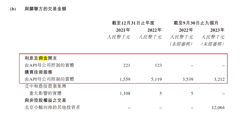 2021年至2023年前9月,公司向由API母公司控制的实体购买技术服务费用分别为155.9万元、511.9万元及321.2万元。