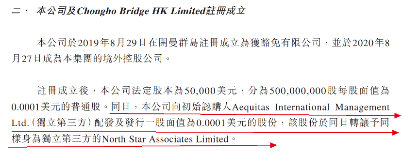 2019年8月,中和农信在开曼群岛注册成立。同日,公司向初始认购人Aequitas International Management Ltd.(独立第三方)发行一股面值为0.0001美元的股份。当天,此股份又转让予同样身为独立第三方的North Star Associates Limited。