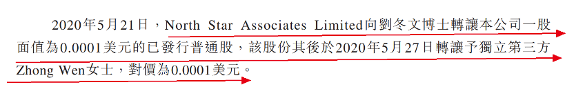 2020年5月21日,North Star Associates Limited向董事会主席兼执行董事刘冬文转让公司一股面值为0.0001美元的普通股,该股份于6日后(2020年5月27日)转让予独立第三方Zhong Wen,对价为0.0001美元。