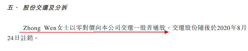 此后,Zhong Wen以零对价向公司交还一股普通股,交还股份于2020年8月24日注销。
