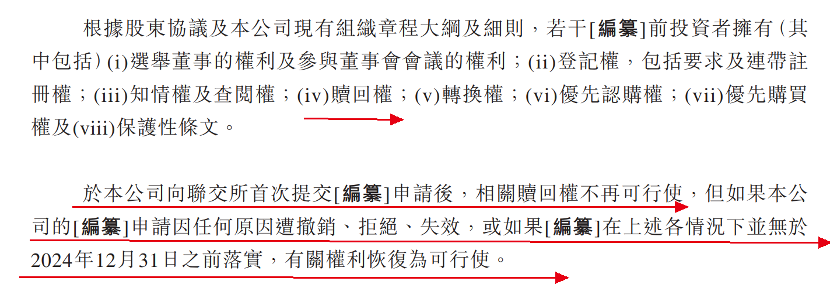 其中,在中和农信向港交所首次提交IPO申请后,赎回权不再可行使,但如果公司的IPO申请因任何原因遭撤销、拒绝、失效,或如果IPO在上述各情况并无于2024年12月31日落实,赎回权将恢复为可行使。