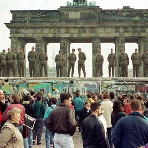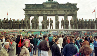 1989年11月11日,东德士兵从被游行队伍推倒的一段墙后看过来。