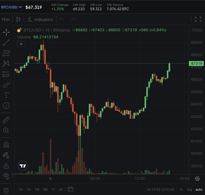 3月6日,据Bitstamp报价显示,比特币重回67000美元/枚上方,收复一度高达12%的日内跌幅。