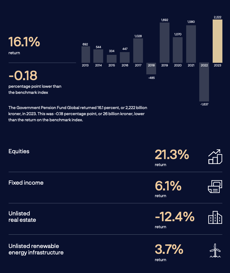 3月6日,根据挪威政府养老金全球基金(GPFG)日前披露的年报,2023年该基金的投资回报率为16.1%,相当于2.22万亿挪威克朗(约合人民币1.52万亿元)。其中股票投资回报率为21.3%,固定收益投资回报率为6.1%,非上市房地产的投资回报率为-12.4%,未上市可再生能源基础设施投资回报率为3.7%。