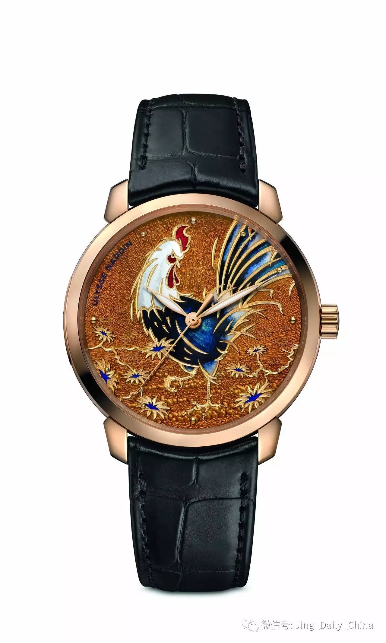 亮点: 又一款珐琅材质中国鸡年图案的手表?恐怕没错,但不仅仅是这样:这款手表拥有自己的个性,被认为拥有久远的生命力。这款88块限量版手表是由18克拉重的玫瑰金和40毫米手表外壳以及瑞士天文台认证的雅典手表UN-815自动上发条机芯构成。其公鸡主题图案是由champlevé珐琅组成,相比其他手表,该款公鸡造型更具象化。表盘上的金色造型更是如虎添翼。对称感极强的造型更增添了艺术气息。