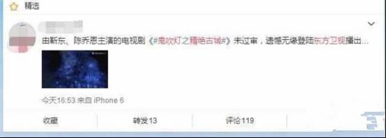 3.电视台停播。《鬼吹灯之精绝古城》在东方卫视开播不久就被下架了,主要原因是《精绝古城》播出后重新审核没有通过,所以不在卫视播放了,这对于喜欢看的观众来说,也有些遗憾。虽然网络播放平台发展至今,已经成为年轻人看剧的潮流,但是各大卫视平台依旧是电视剧播出的重要渠道,也是主流观众的看剧选择。没能在卫视上如期播完,对《精绝古城》来说也是一大损失。
