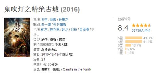 即将要播完的网剧《鬼吹灯之精绝古城》,在豆瓣上维持在8.4,这对于国产剧尤其是网剧来说并不容易。2016年《老九门》、《幻城》、《诛仙 青云志》等IP剧纷纷口碑扑街,让很多粉丝对这些网文改编电视剧失望。2016年末开播的《鬼吹灯之精绝古城》(以下简称《精绝古城》)又将国产剧的水平拉回了正常值。