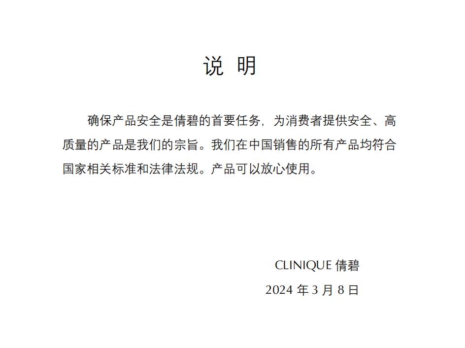 对此,倩碧品牌对界面时尚回应称:确保产品安全是倩碧的首要任务,为消费者提供安全、高质量的产品是我们的宗旨。我们在中国销售的所有产品均符合国家相关标准和法律法规。产品可以放心使用。