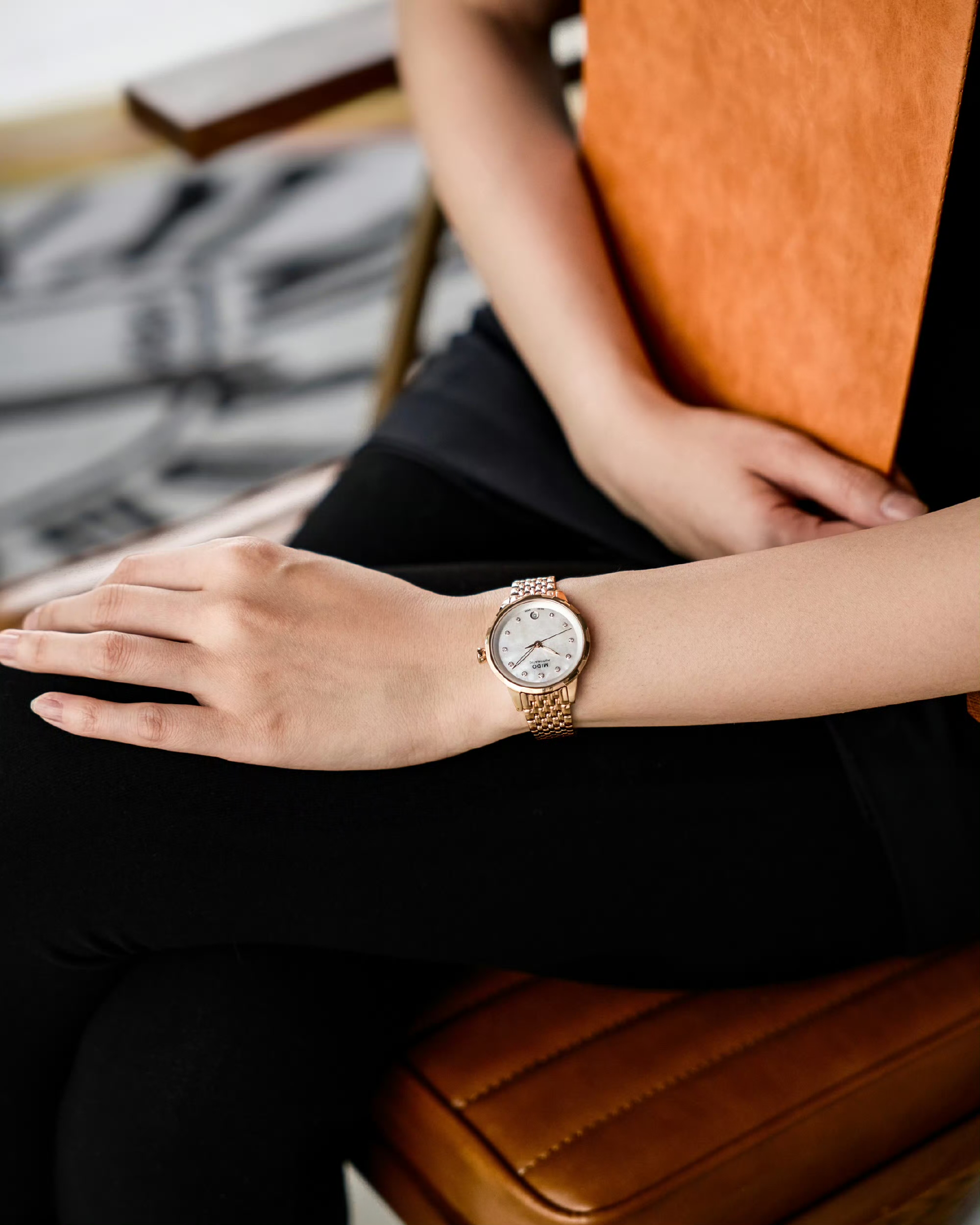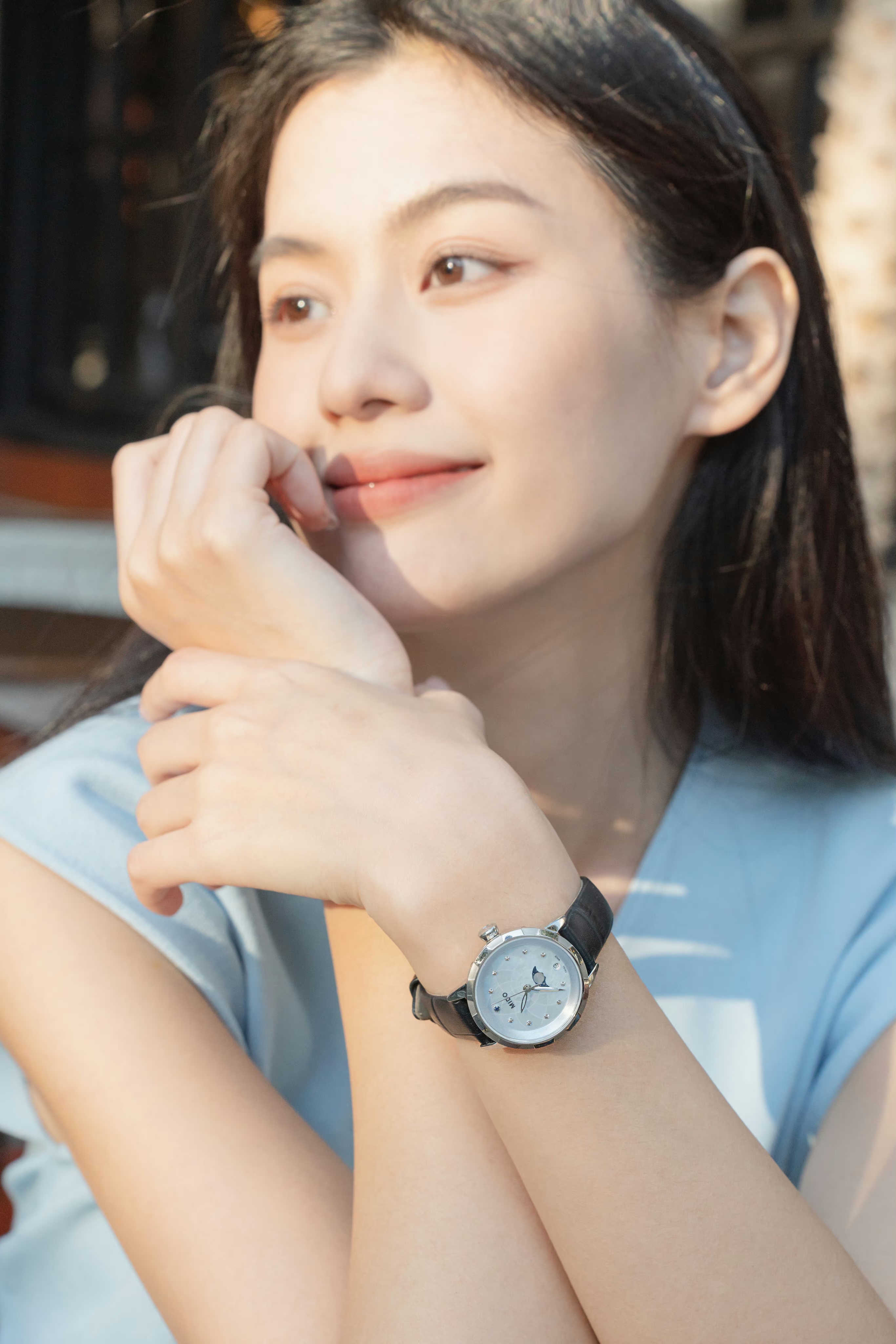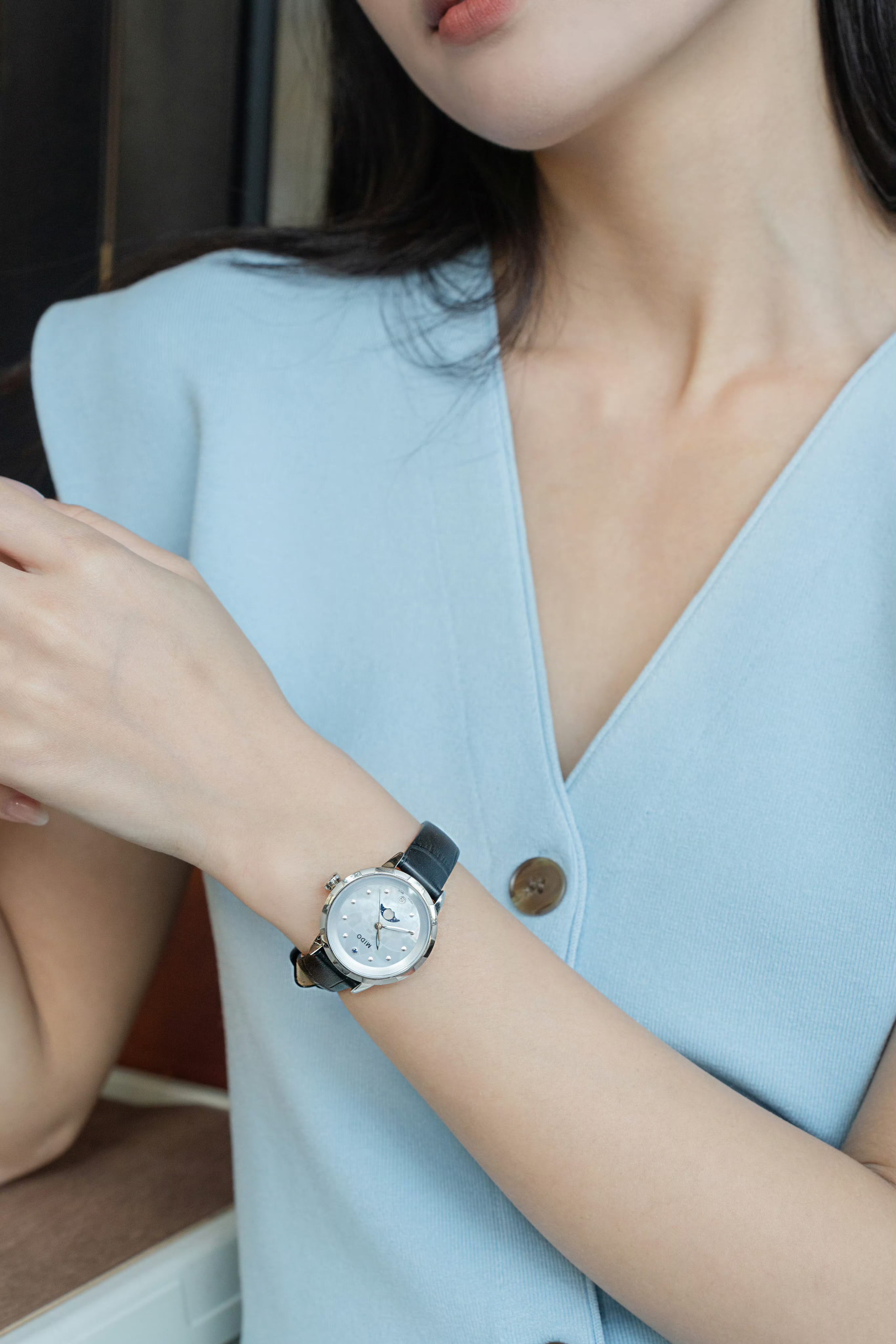 时光流转,月色倾心。瑞士美度表花淅系列月相腕表蓝色珍珠贝母表盘,搭配同色系真皮表带,绽放熠熠光彩。莲花花瓣点缀其上,月轮交替,尽显雅致风采。环系玫瑰金色表带,勾勒曼妙曲线。灵感,花漾绽放。花淅系列月相腕表让佩戴者大方得体步入职场,释放温暖真诚,勇气化灵感,常伴成长路。