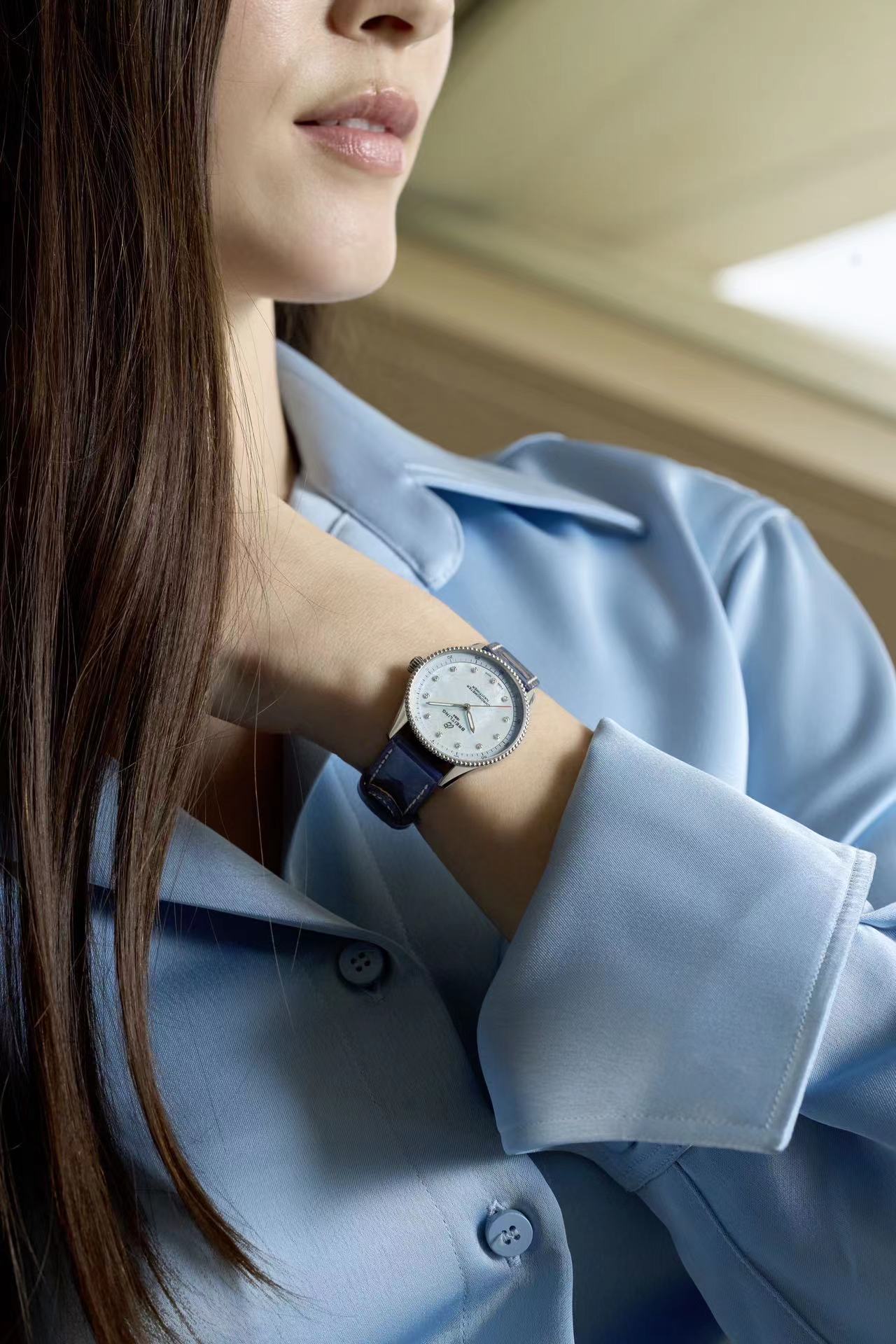 腕间的迷你黛绰维纳系列腕表,纯色Cosmo表盘方圆相济,映照她的刚柔并济;矩形精钢表壳搭配全新表链,透露她不从众的时尚风格。康卡斯潜水系列腕表,32毫米精钢表壳内,黑色陶瓷表圈坚固耐磨,搭配白色珍珠母贝表盘,正如她坚韧外观下包裹着柔软内心。双折式安全表扣搭配潜水延展装置,运动活力的设计,也陪伴她迎接挑战,以专业表现绽放真我个性。