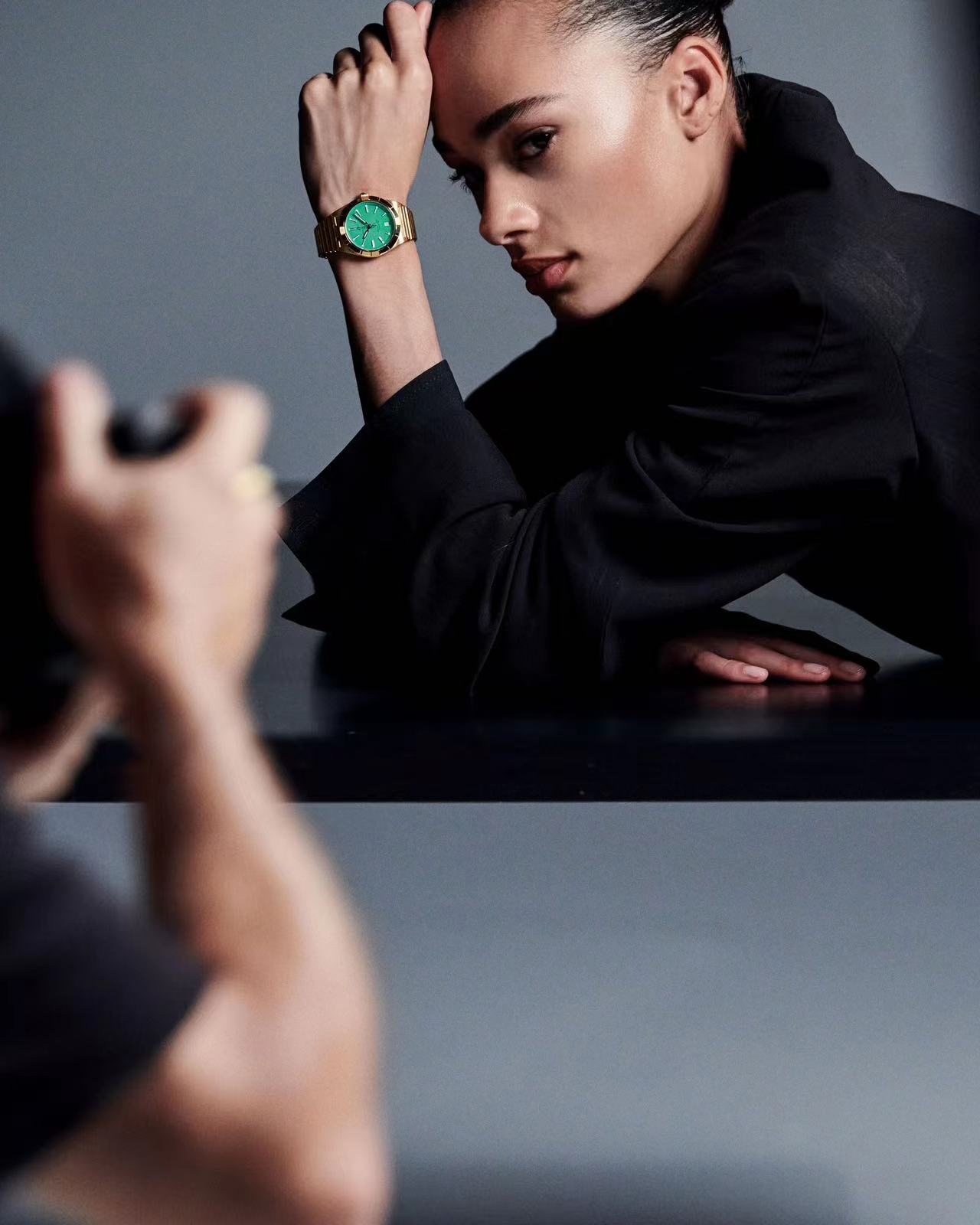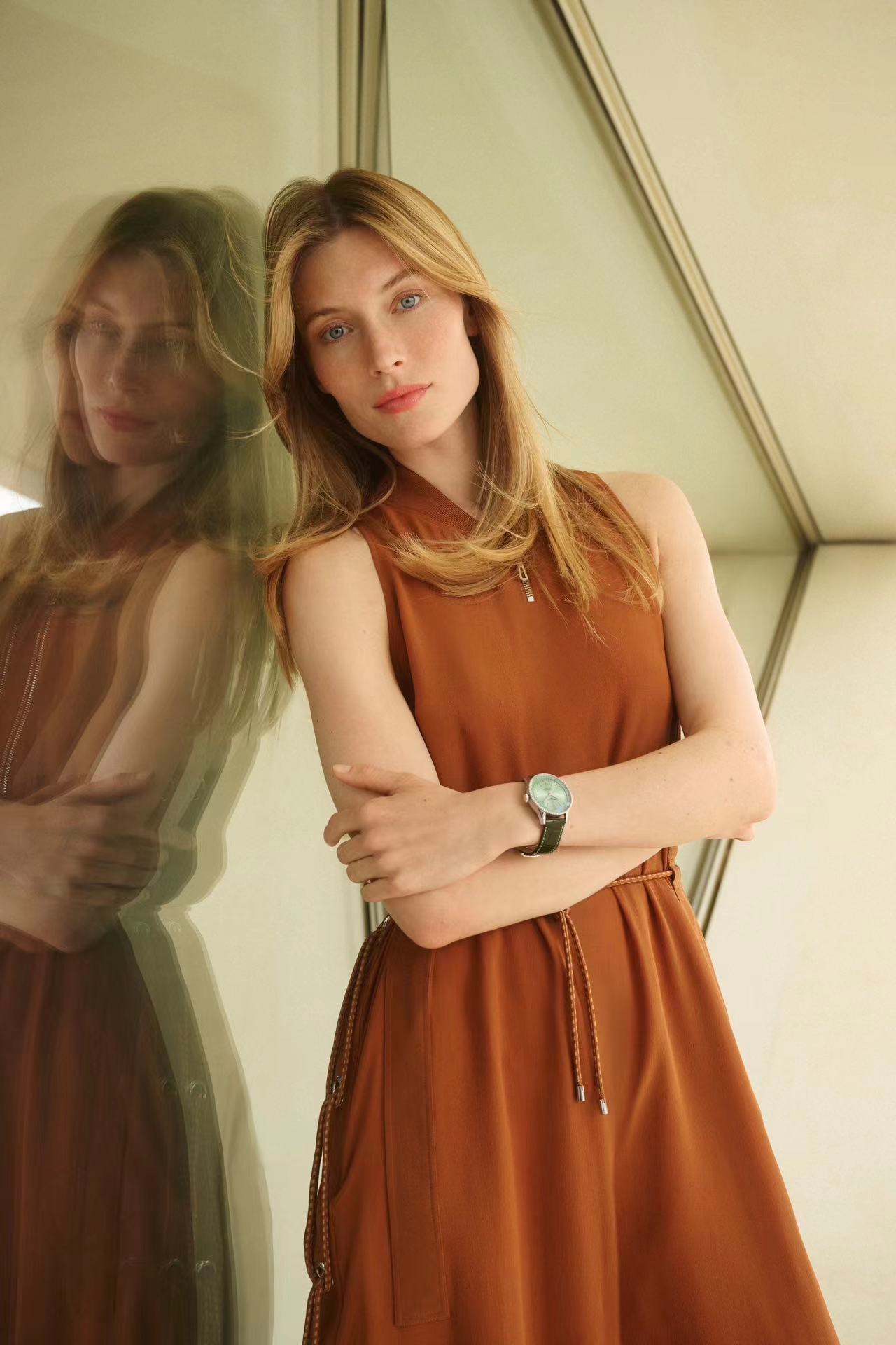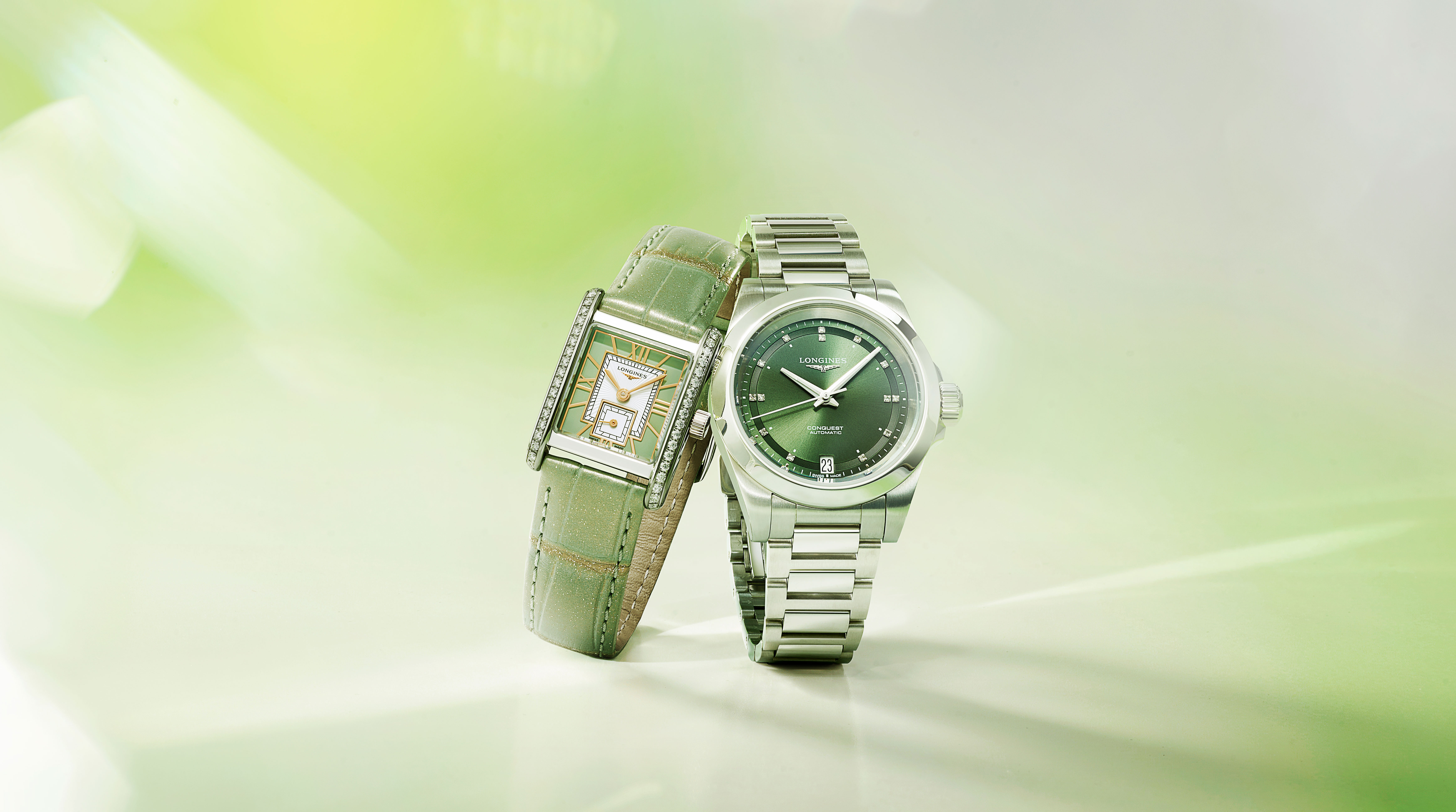 浪琴表全新康卡斯系列悦动腕表,阳光绿太阳纹表盘饰以钻石时标,伴随光线变幻,腕间光芒流转,诠释她的优雅活力。迷你黛绰维纳系列腕表,则以清新的薄荷绿表盘搭配同色短吻鳄鱼皮表带,表壳外镶嵌明亮美钻,与镀金指针交相辉映,散发温柔光芒。