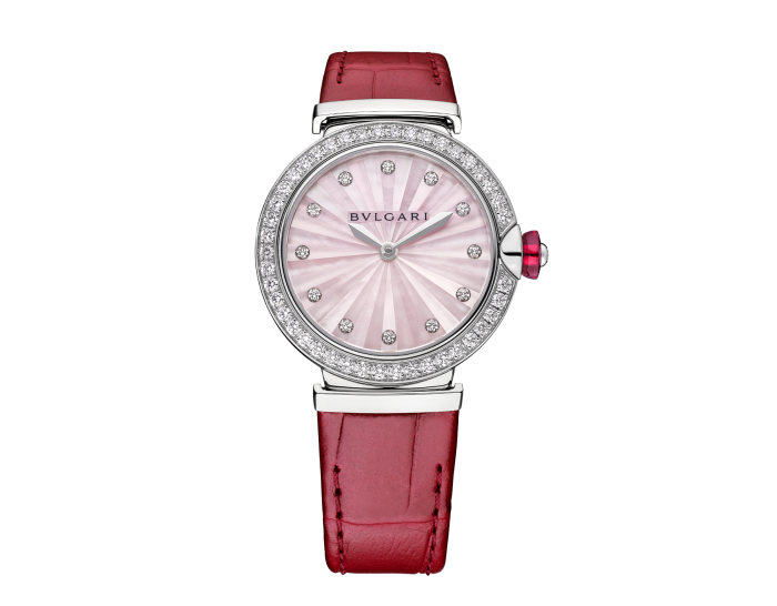 宝格丽LVCEA系列腕表从经典嵌花工艺汲取灵感, 3D立体结构的珍珠母贝表盘搭配钻石时标,折射华美光芒,粉色鳄鱼皮表带与凸形单面切割的红碧玺表冠交相辉映,尽展动人心扉的精致格调。