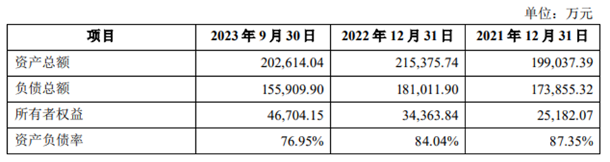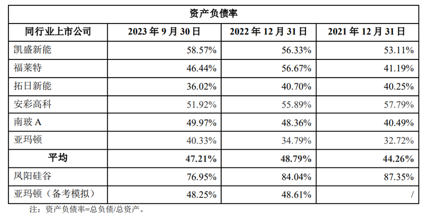 因为三家PE的集中退股,让凤阳硅谷负债率迅速攀升。公告显示,报告期各期末,凤阳硅谷资产负债率分别为87.35%、84.04%、76.95%。这显著高于同行上市公司,是一个危险信号。
