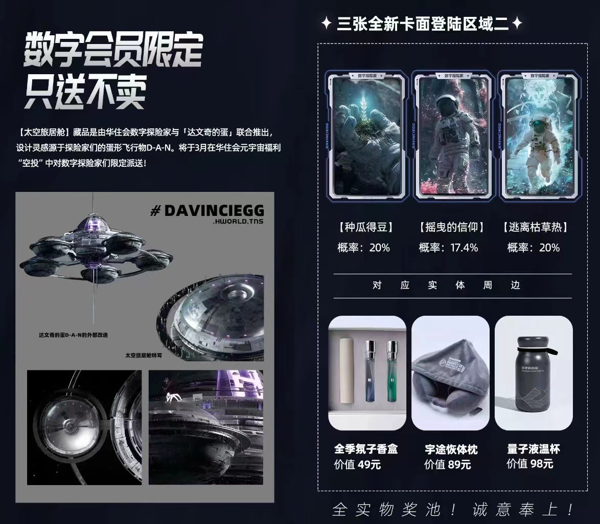 “本次联名的主角“达文奇的蛋”是Web 3.0时代国内知名科幻原生数字IP精品,曾与中国航天官方合作背书,其出品方“唯一艺术”是国内为数不多的由国有资本参与投资的数字艺术电商平台。除此之外,华住会元宇宙会员在探索中,可通过解锁剧情和卡牌赢取限定款行李箱等周边好物和华住会酒店权益券等奖励。完成探索五大区域、集齐卡牌即可赢得珍藏版蓝宝石实体卡“华住会永久铂金会员”等高价值权益,让会员们更有参与动力。